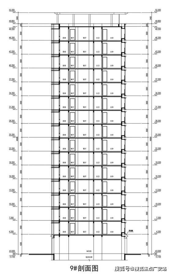 以9幢住宅(16F)为例,住宅架空层层高4.2米,住宅标准层层高3米。
