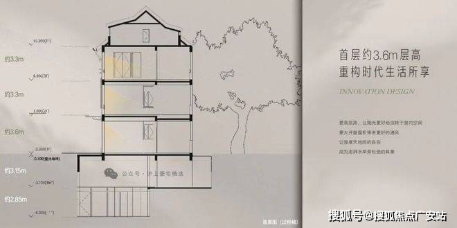 约3.6m首层层高,阔尺采光面。