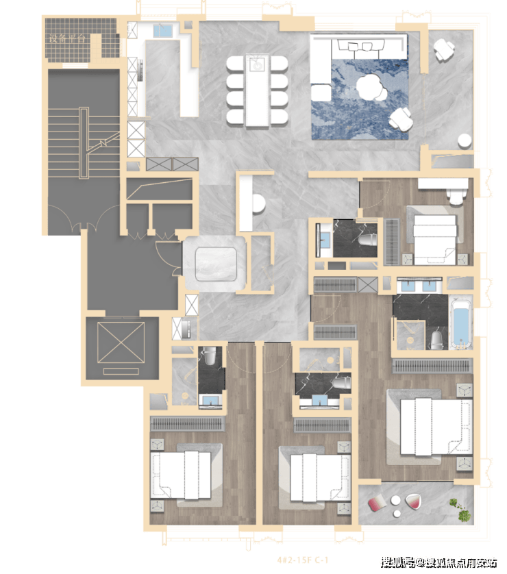 尤其主卧星级套房,配置独立衣帽间、书房,奢华主卫四分离,双台盆+淋浴区+大浴缸+智能马桶,私密性&奢适度无敌;