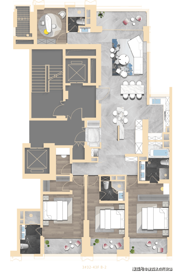5开间朝南,4卧朝南,双卧套房设计,南向超大采光面,让阳光和清风肆意流淌;