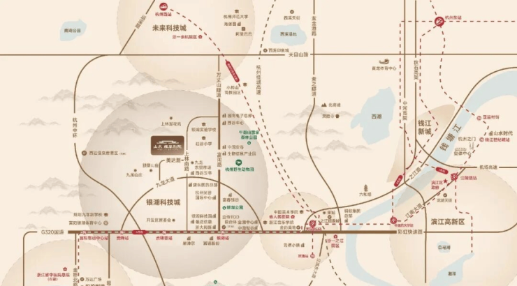项目位于银湖科技城融杭门户,抢占交通资源高地,约1500米连接杭州地铁6号线虎啸杏站,瞬达杭州主城核芯。毗邻G320国道与彩虹快速路西延段,形成快速融杭交通走廊。