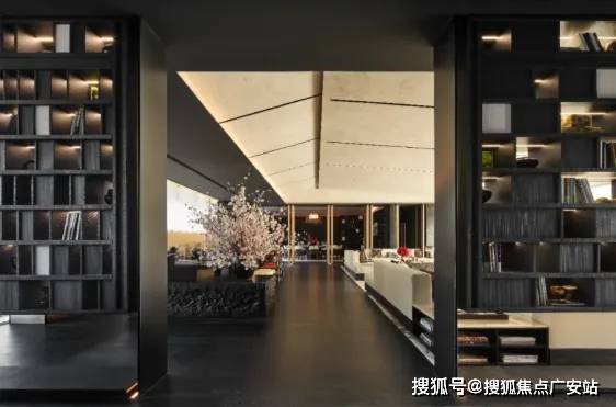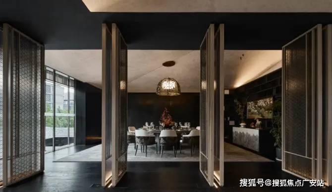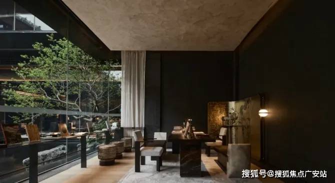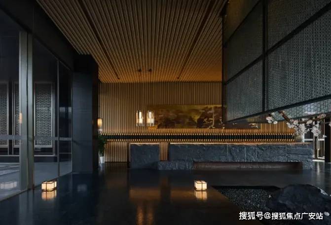 主入口旨在营造隐逸雅奢的宋风门府。在有限的用地条件下,团队采用非对称式门头布局方案,通过迂回的行进路线营造曲迤婉转的空间体验,既弱化了空间秩序,又通过延迟抵达和感官积累创造了心理上的仪式感,回应了都市高端项目对“低调奢华”空间场域感的诉求。