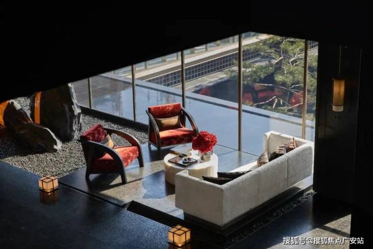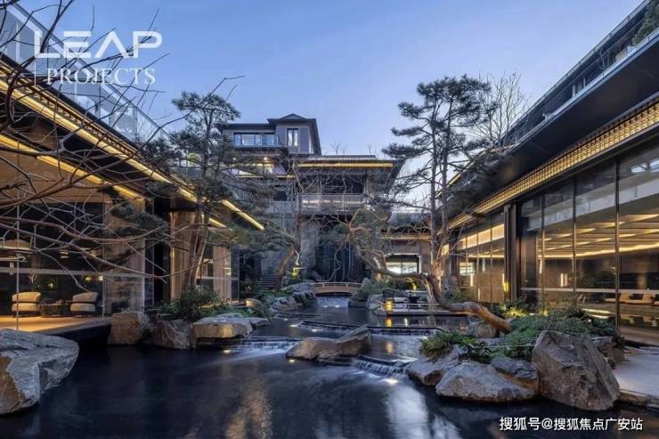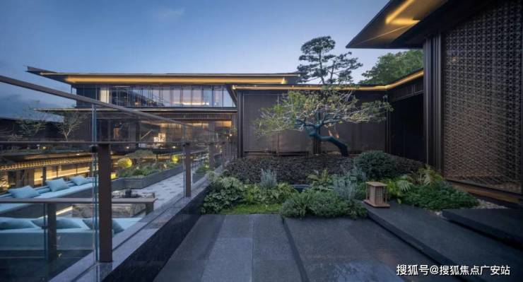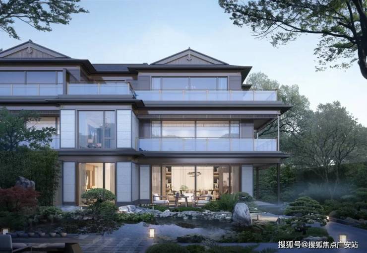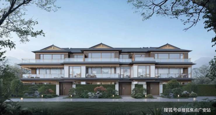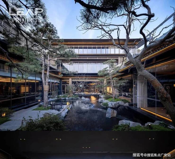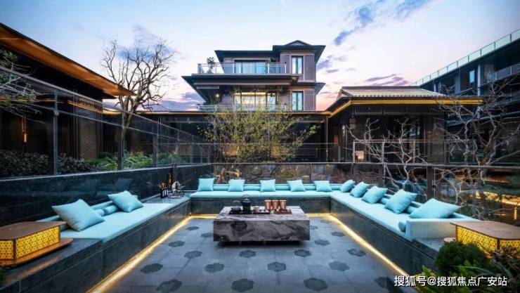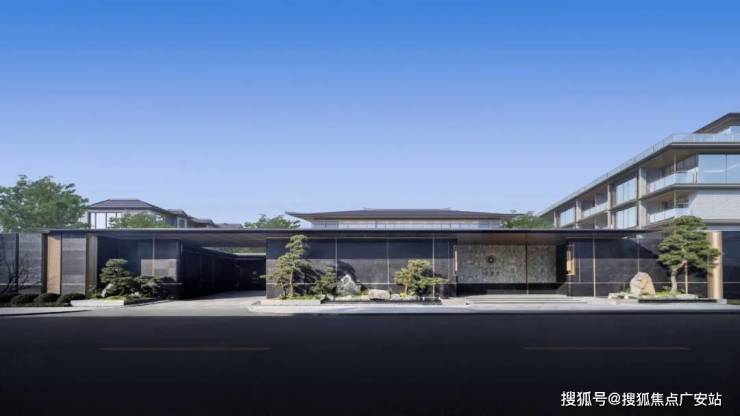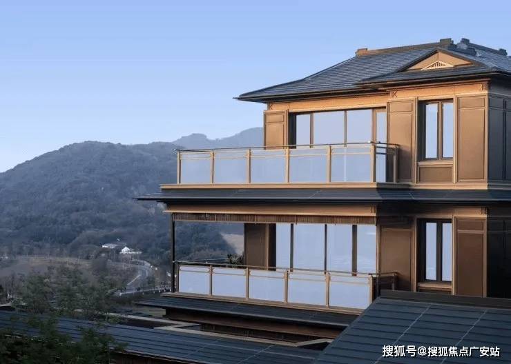 建筑外立面以香槟金铝板为基调,搭配蓝眼睛石材与玻璃幕墙,融合传统歇山重檐、纳福悬鱼等元素,既保留宋式建筑的对称美学,又赋予现代建筑的轻盈通透。合院组团采用三面庭院设计,L型景观面与环绕式檐廊,将超山梅影、丁山湖光引入每一扇窗景。