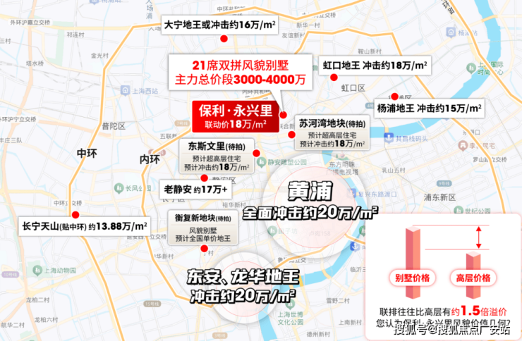在这样的市场下,想捡漏几乎难如登天 —— 除非你瞄准核心区的 “遗留项目”。保利・永兴里就是这样一个 “宝藏”:作为上海取消限价前拿的地,它的别墅联动价 18 万 /m²,放在现在看,简直是内环里的 “价格洼地”!