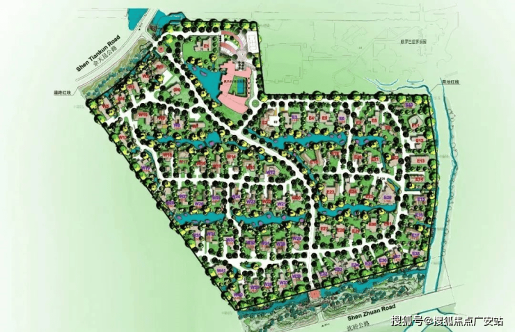 道路两旁的绿化带分别以高中低三个层次种植了常绿植物、落叶植物、球类植物和色块灌木,打造了幽静而深远的生活意境。
