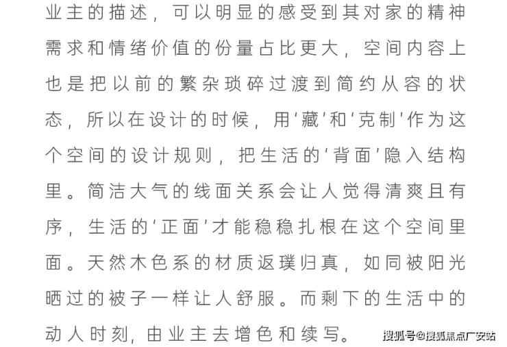 业主说:我现在就处于一个‘做减法’的人生阶段,孩子大了,家人的工作和生活也都稳定了,以前住的空间都是千家万户的大多数,现在就想改变一下,甚至是突破自己,希望给自己和家人一个全新的生活方式,如果非要我给出要求的话,我就希望我回家以后是可以赤脚走在家里,随意靠在墙边或者坐在家里的某个地方,我内心平静一点点,我的身体舒展一点点。