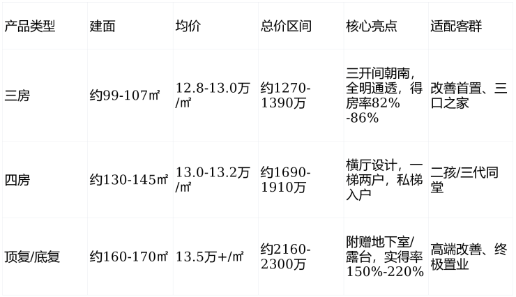 核心优势:央企中建精工背书,交付有保障;内环滨江+超低密1.4容积率+纯3层风貌洋房,上海内环稀缺;得房率高(82%-86%)+高附赠,性价比突出;东外滩九宫格统一规划,圈层纯粹。