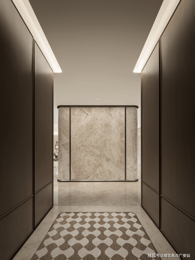 玄关区域打造一处影壁,简单的格纹向内延展,为室内增添张力。对称的几何结构沉稳规整,以严谨的序列为空间创造家居与外在世界的边界。