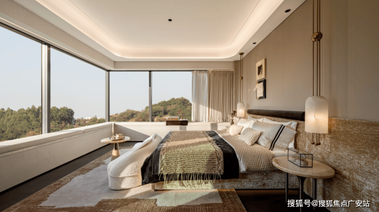 270°的落地窗赋予卧室流动式的景观,由静态的天然意境再次回归自然与家居同频共振的整体感。不只是视觉,清风、暖阳、山野湖景的轮廓借光现行,融进室内的空气中,乃至居住者的日常里。