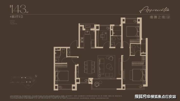 143㎡ 4 房 2 厅 3 卫:四开间朝南,7 米横厅 + 270° 阳台