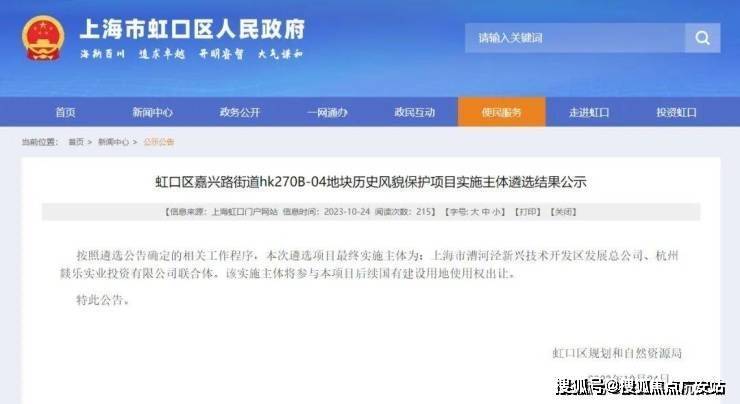虹口区嘉兴路街道hk270B-04地块历史风貌保护项目实施主体遴选结果公示,终确定由上海市漕河泾新兴技术开发区发展总公司(临港集团)及杭州燚乐实业投资有限公司(越秀)联合开发。
