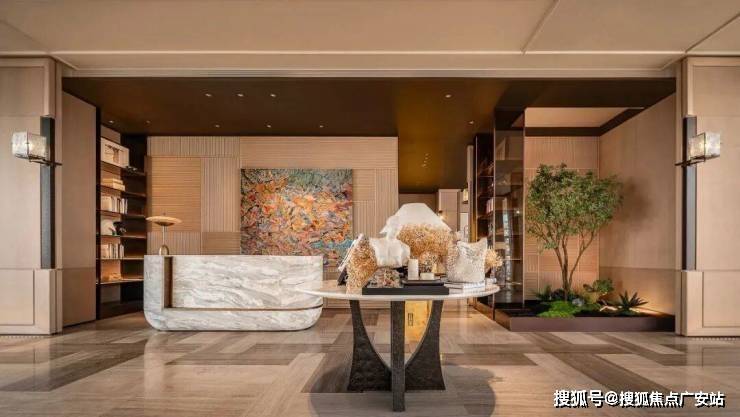 社区大堂极具仪式感,未来会采用地下会所设计,入口采用三重弧形石材墙体+圆角幻彩穿孔顶,夜幕下如流淌的鎏金河流。