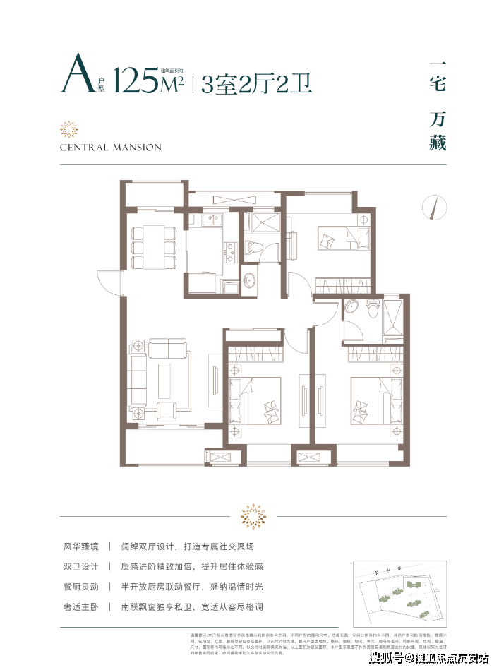 主力:60㎡1 房、90㎡2 房、125㎡3 房,户型方正、南北通透、动静分区,空间利用率高