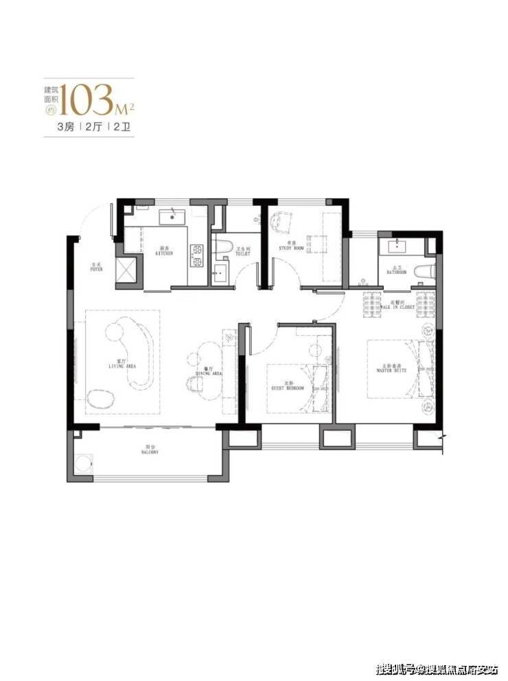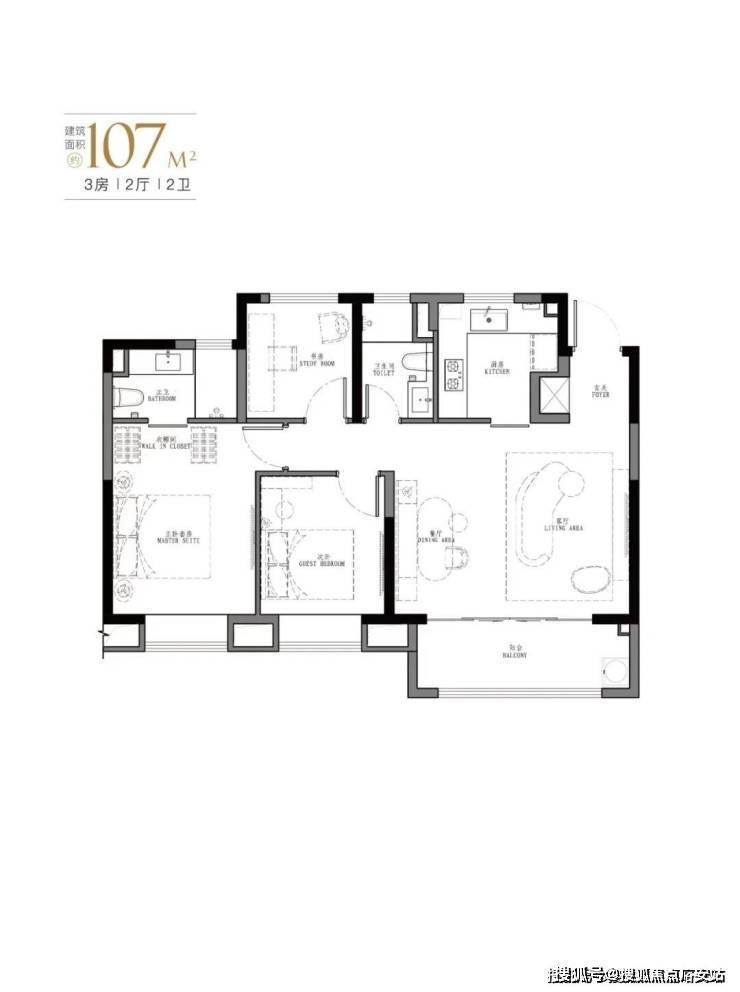 107㎡是103㎡户型的PLUS版,厅面宽达到5.5米。汲取了103㎡户型所有的优点;如餐客厅一体,U型厨房,动静分离设计,大尺度主卧套间,以及每个卧室都附大面积飘窗。