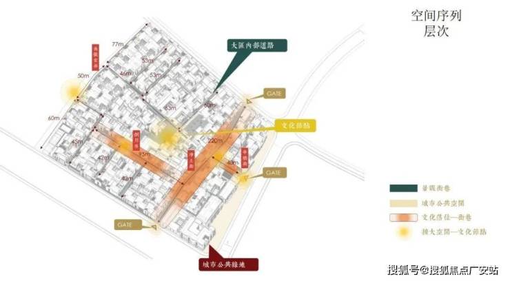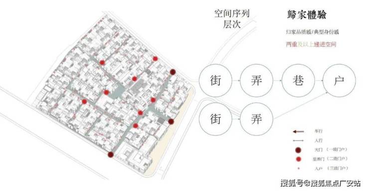 士林润园社区规划可分为蓬莱路城市公共景观以及社区内部景观两个部分,其中市政绿地衔接于上海2035城市总体规划中“蓝绿丝带”的上位条件要求,社区内部街巷空间形成空间序列形成递进的层次,将归家体验的序列依次展开,形成城市街道→入口(一级门户)→街巷→节点空间→里弄门(二级门户)→合院入户(三级门户)的方式,基本可保证大多数住户可体验到两重以上的空间递进。