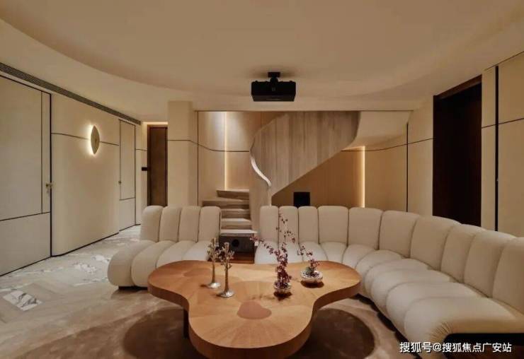 顺着弧形木质楼梯抵达地下空间,仿佛游走在一曲流动的乐章中。一切都共同呼应着水的特质,传递着低调隐逸情怀与圆融个性。