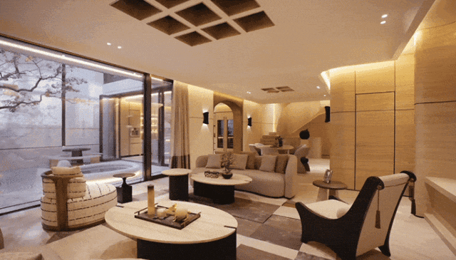 这一层更聚焦于私谈、影音、娱乐、品酒、饮茶,深沉又静谧。近6米高的垂直挑空玻璃壁炉矗立于眼前,如同一件令人赞叹不已的大型雕塑装置,它弱化了空间中的大理石承重柱,将其纳入共同构成一个完整的全新的装置,集功能性与艺术性于一身。