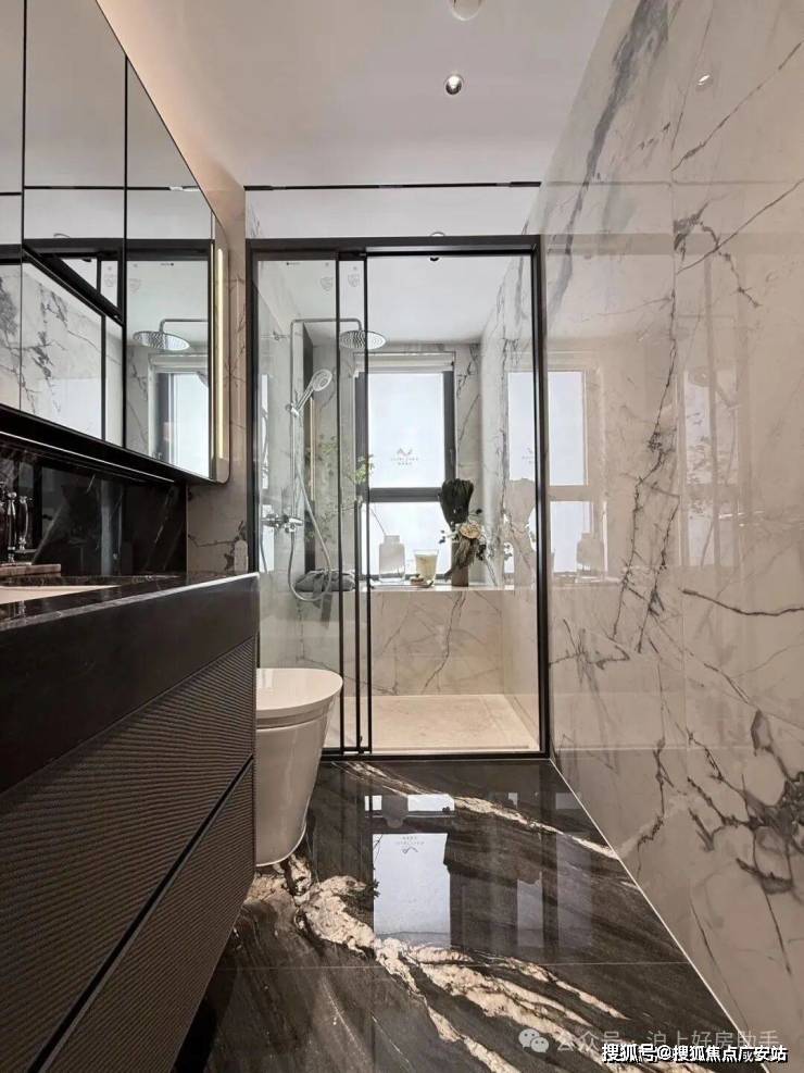 卫浴墙面采用寒江雪大瓷砖铺装,淋浴部分地面选用整块天然大理石。