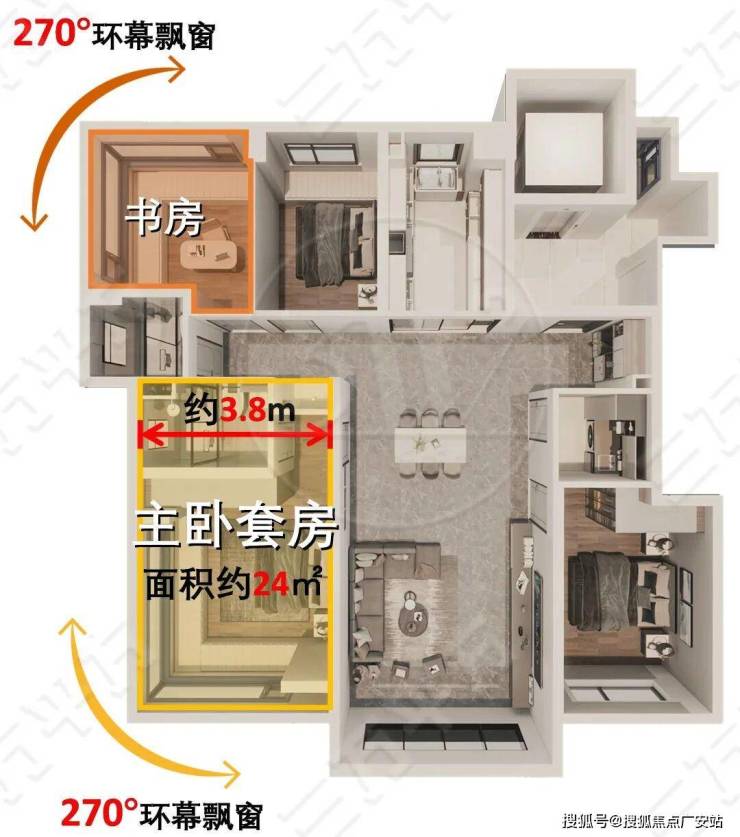 主卧与北侧书房均配置双转角环幕飘窗,270° 观景视野让晨起的第一缕阳光、夜晚的城市灯火都能更好的纳入室内;主卧尺度更是大幅进阶—— 开间从约 3.4 米拓宽至约 3.8 米,套房面积也从 115㎡户型的约 20㎡扩容至约 24㎡,私密感与舒适度双双拉满。
