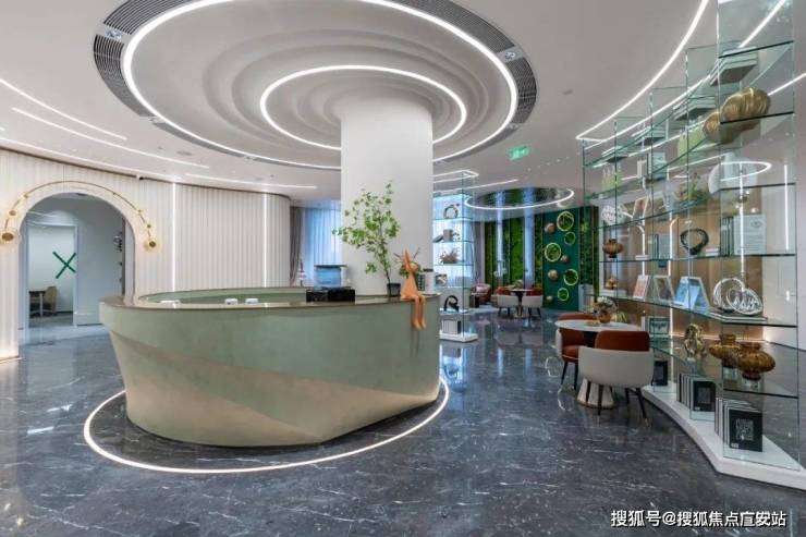 【陕西南路888】外立面,在梧桐树叶的簇拥下,白色的立面挺拔庄严,辨识度极高!内部公区,从入户大堂,到电梯间再到售楼处,色彩明亮,大气恢弘,品质感十足的同时,充分彰显业主的品位!