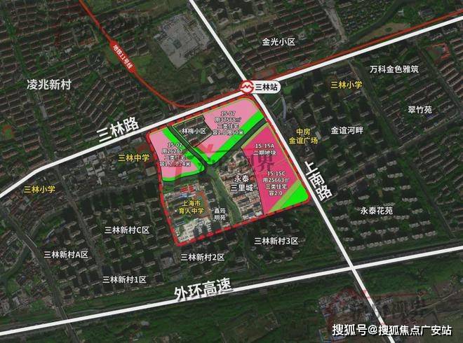 该地块为三林镇金光村“城中村”改造的重点项目,紧邻地铁11号线三林站,规划一条12米宽公共步行通道,连接社区与地铁站;同时周边有中房金谊广场、三林中学、东方医院等生活配套。