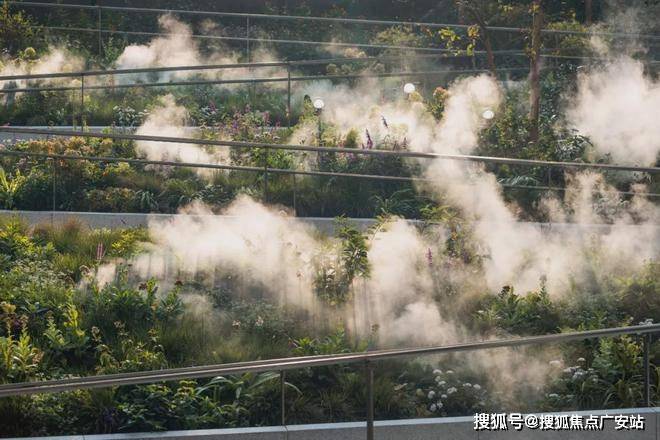 花境区域以柔美、浪漫为主要基调,以绿色和白色为主要色彩,间以清爽的蓝、紫花卉,形成清新浪漫的花境感受,同时结合雾森系统,制造浪漫气氛。