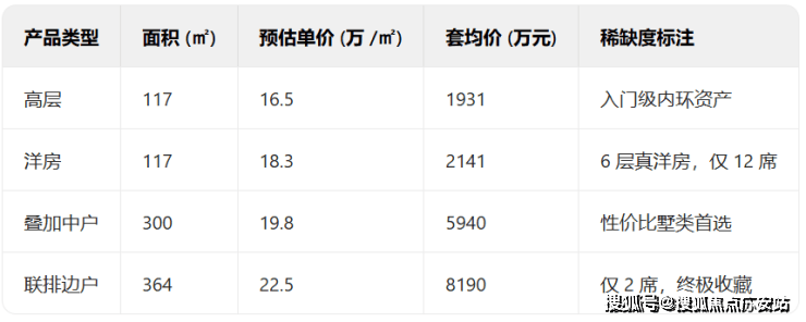 ①建面约117㎡高层/洋房:预估均价:高层16.5-17万/㎡,洋房18.3-18.7万/㎡,总价控制在1900-2200万之间;