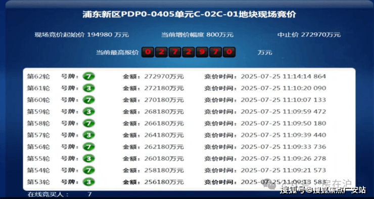 7月25日,2025年上海六批次土拍中,浦东新区PDP0-0405单元C-02C-01地块吸引了7家房企参与竞拍。经过62轮激烈竞价,该地块以40%的溢价率封顶,并进入竞高品质环节。