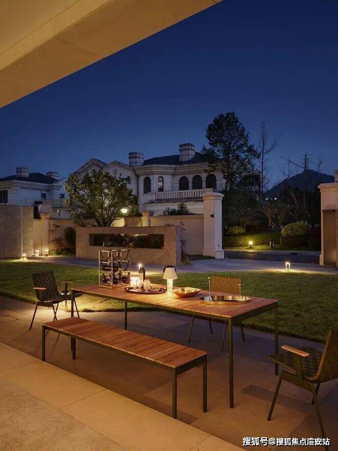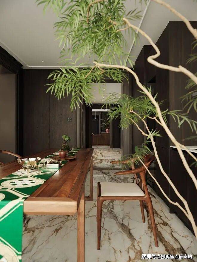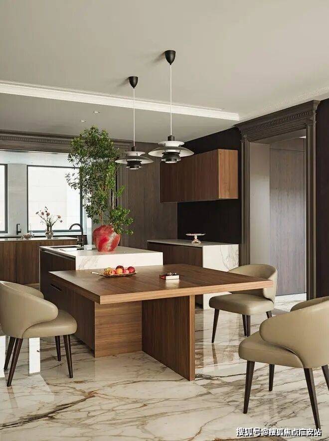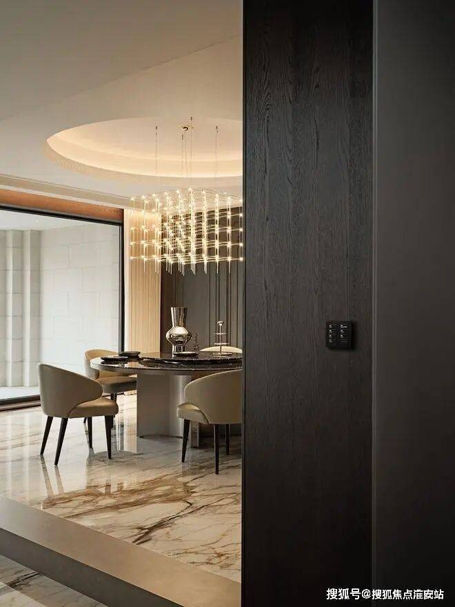 中西双厨选用Dada橱柜,岛台延伸作为早餐和休闲区,10人位的圆形餐桌,暗合东方“团圆”意象,落地窗将客厅、餐厅、茶室与南花园串联为流动的整体。