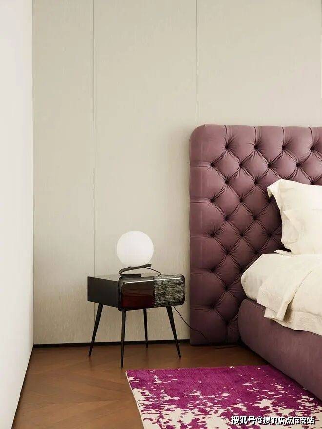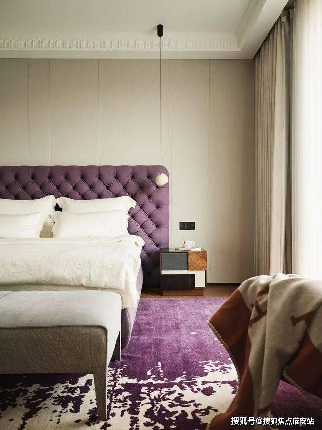 当第一缕晨光吻过窗棂,浅紫色床榻如初绽的薰衣草田,与地面流淌的紫色云霭相映成趣。