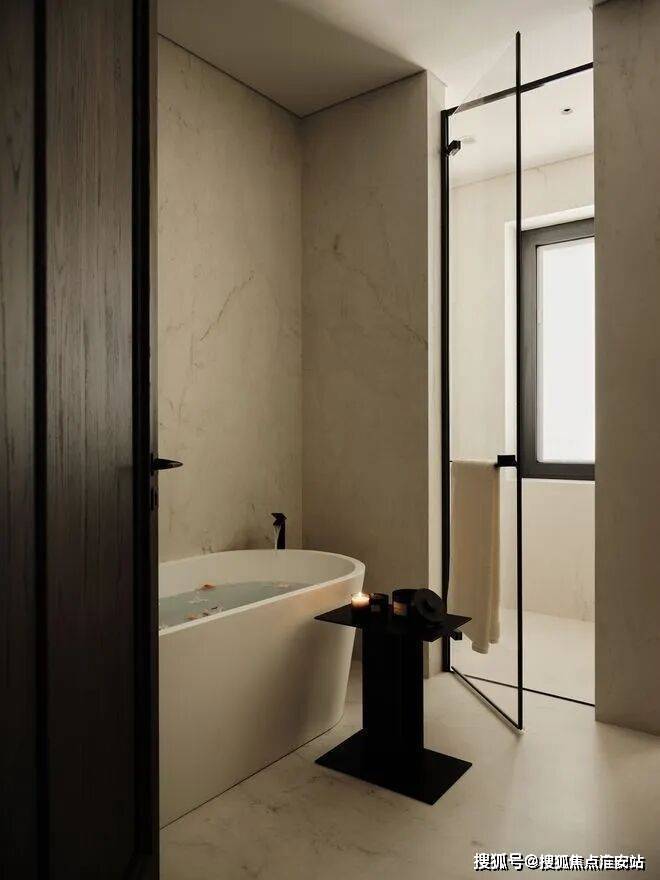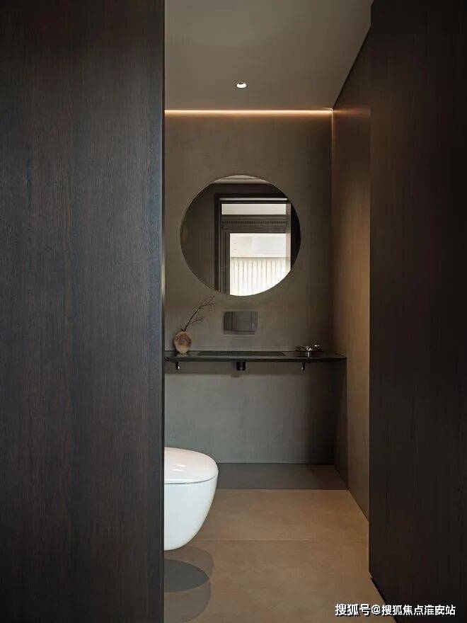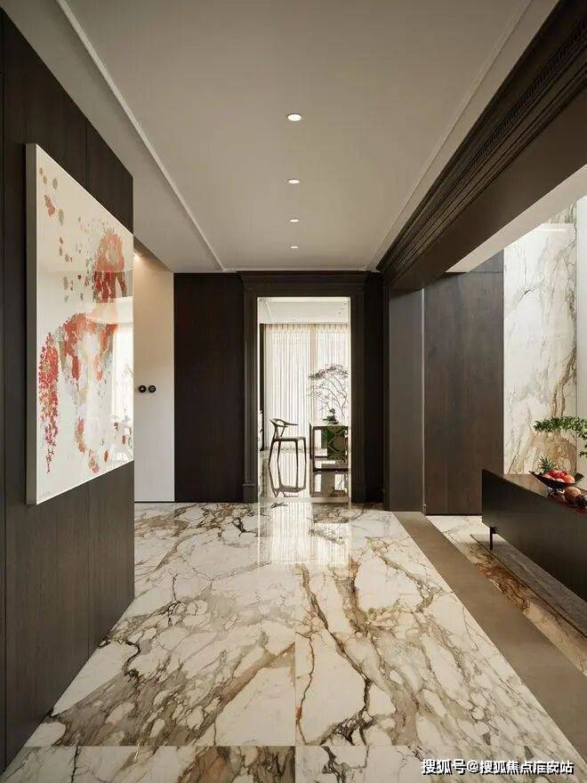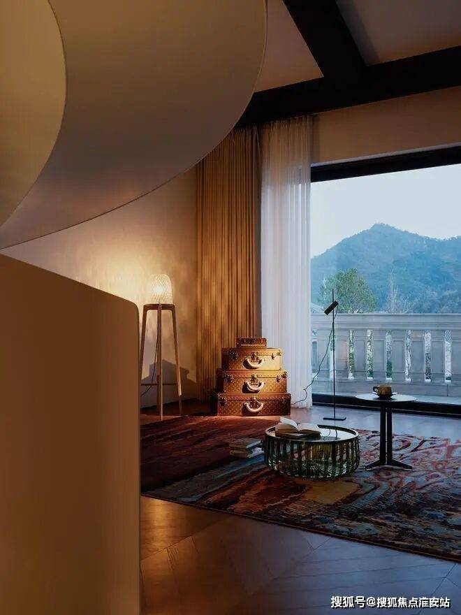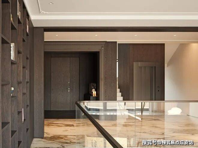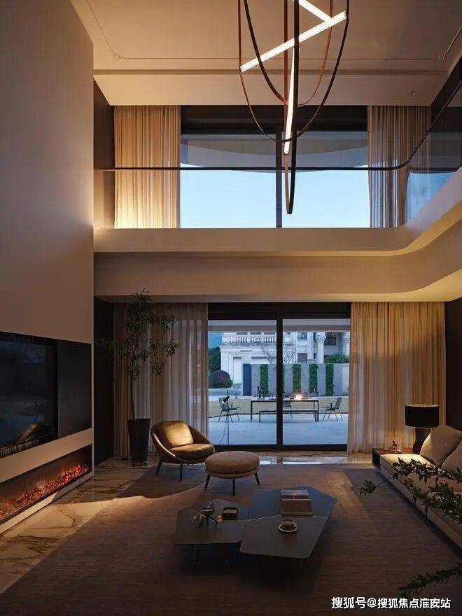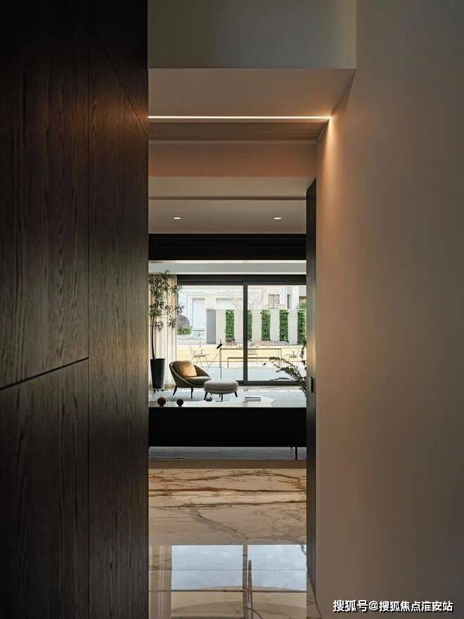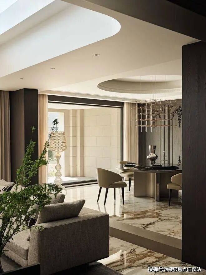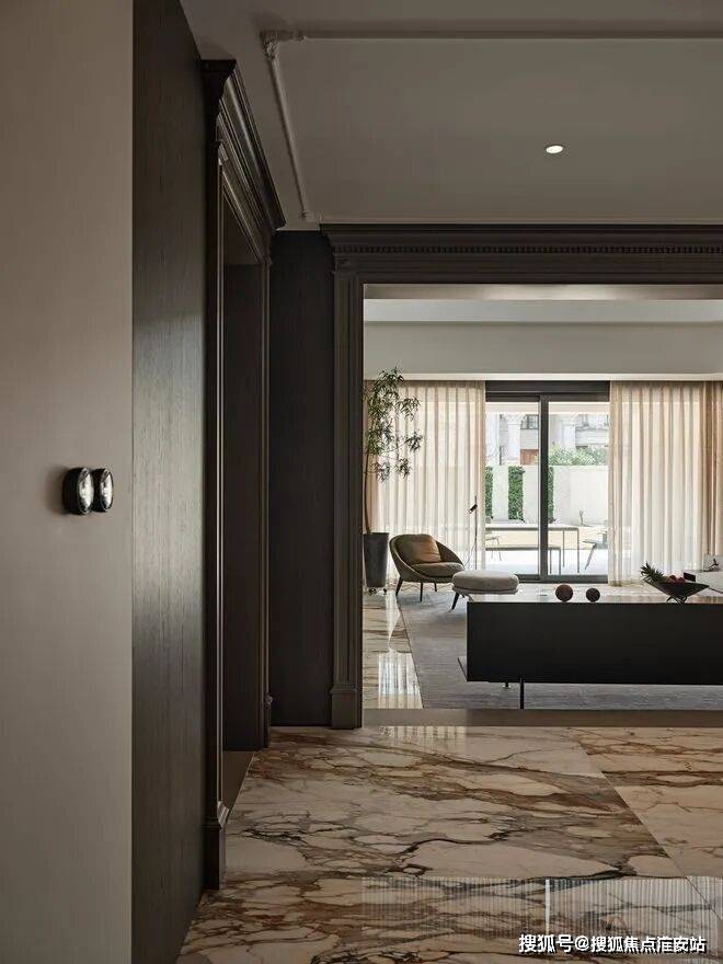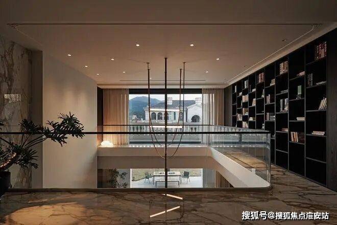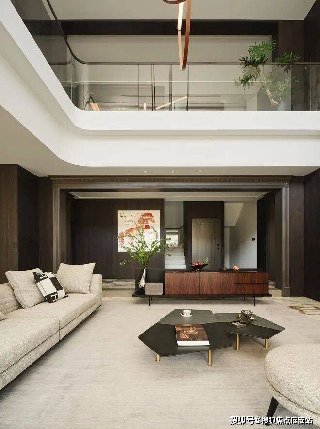 房子内部以“垂直生长”回应家族生命周期。一楼作为家庭社交中枢,6米多高的挑空客厅以卡拉卡塔金大理石纹为幕,石材纹理如水墨恣意流淌,灰色的手工地毯以“时光的褶皱”为精神内核,与Minotti的家具构成刚柔对话。