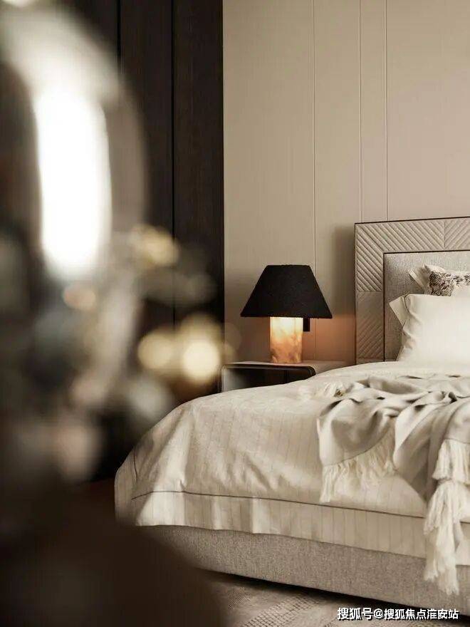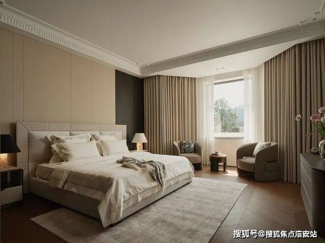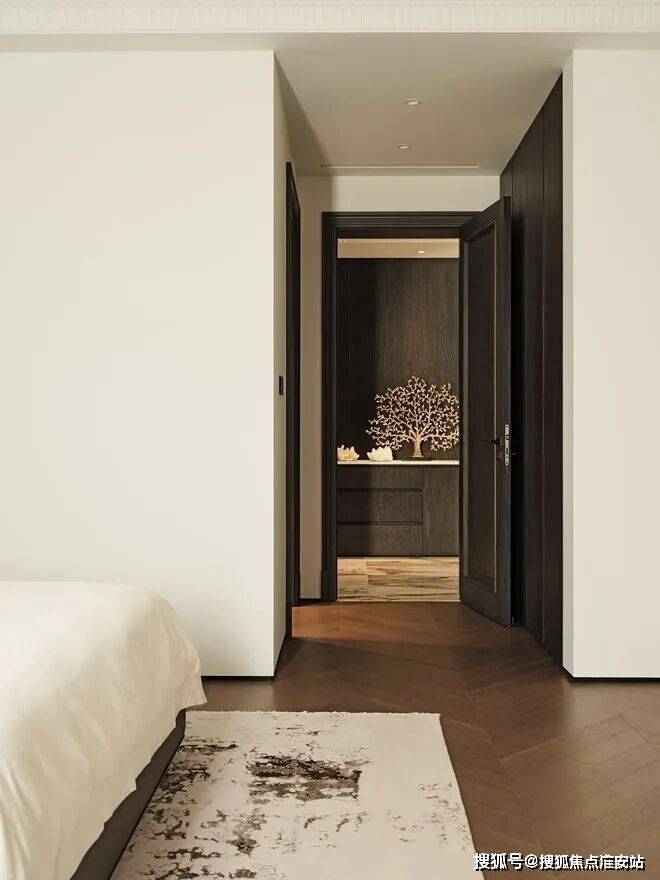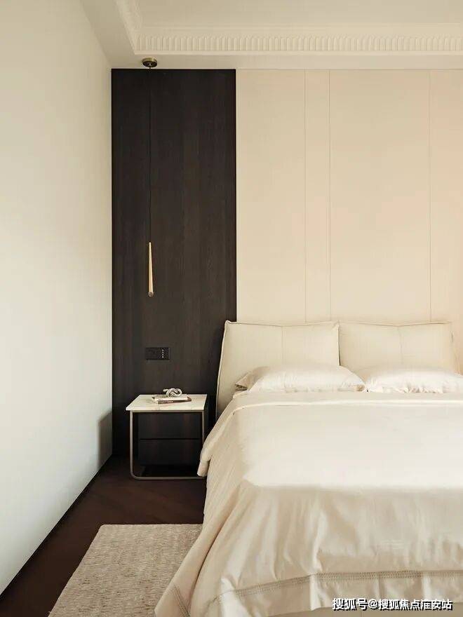 三楼围绕家庭起居厅布置卧室。卧室的地毯是由黄亚兰原创设计的《流动的暮色诗境》,精致的家具与手工羊毛地毯温柔包裹新生家庭的私密时光。