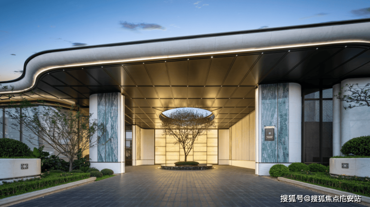 社区主入口是超宽幅门头,宽约 80m 高约 7.1m,两侧的维多利亚绿奢石以及中央的白雪公主透光石很吸睛,浅色的部分则是贝金米黄石材,圆弧的工艺处理也更显温润及价值感,中央栽植的超大紫薇树拥有约60年树龄,底部则是采用宝格丽黑奢石作为基座。