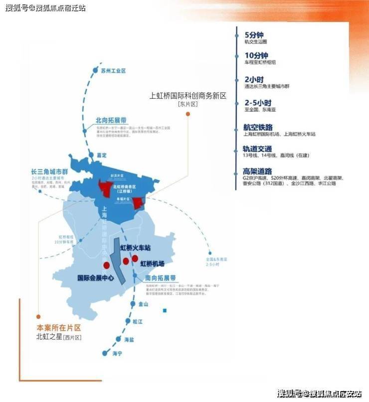 北虹桥作为虹桥国际开放枢纽的创新承载区,兼具“长三角,大虹桥”的双重区位优势,将承载虹桥国际中央商务区主导功能,成为链接辐射长三角的创新经济集聚区、中央商务配套区和高品质国际化社区。“上虹桥·城市更新区”项目围绕“开放北虹桥,创新领航地"总体定位,以承载虹桥商务区主导功能、链接辐射长三角为方向,聚焦打造创新经济集聚区、中央商务配套区和高品质国际化社区,引领赋能虹桥国际开放枢纽北向拓展带发展。(数据来源《上虹桥·城市更新区规划发布》)●交通与基础设施建设: