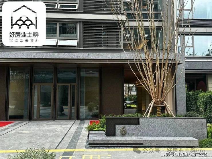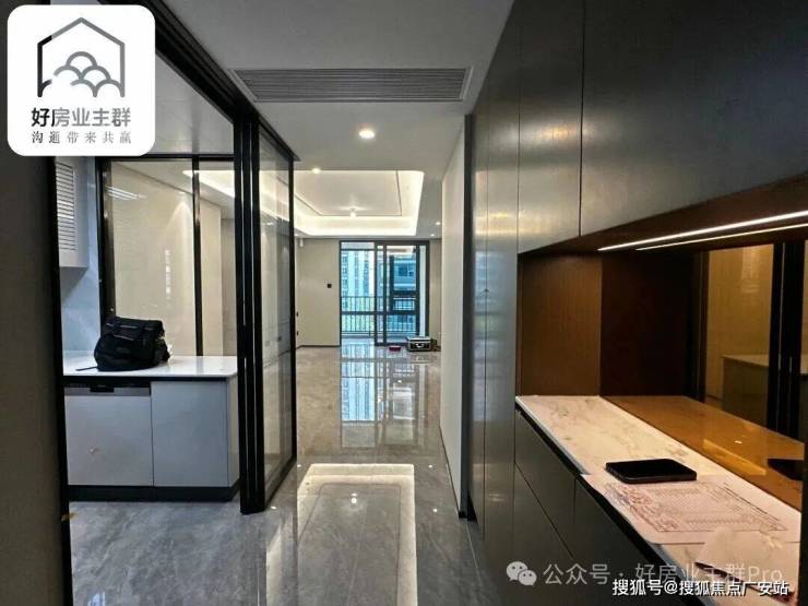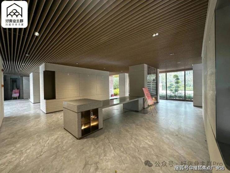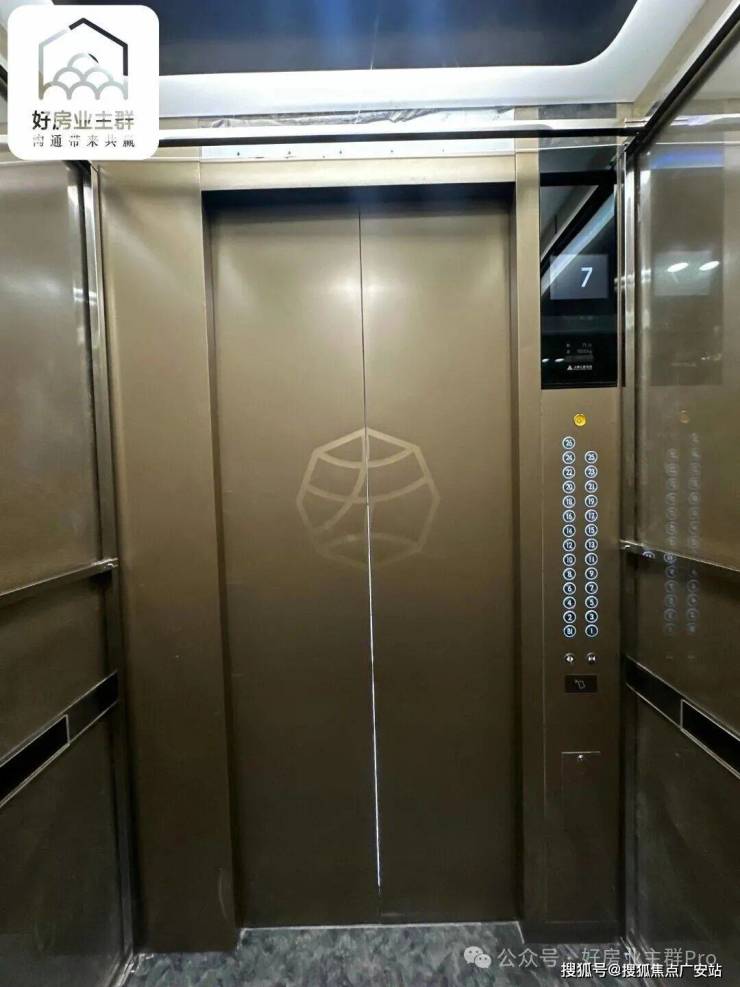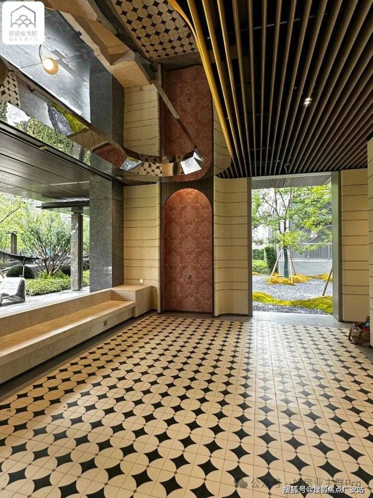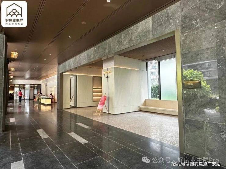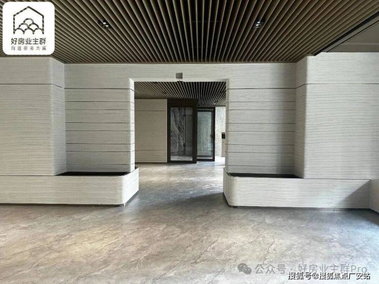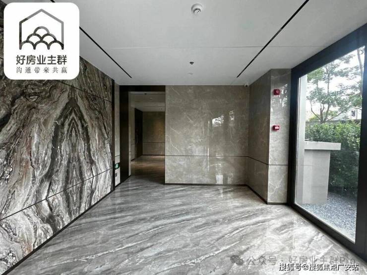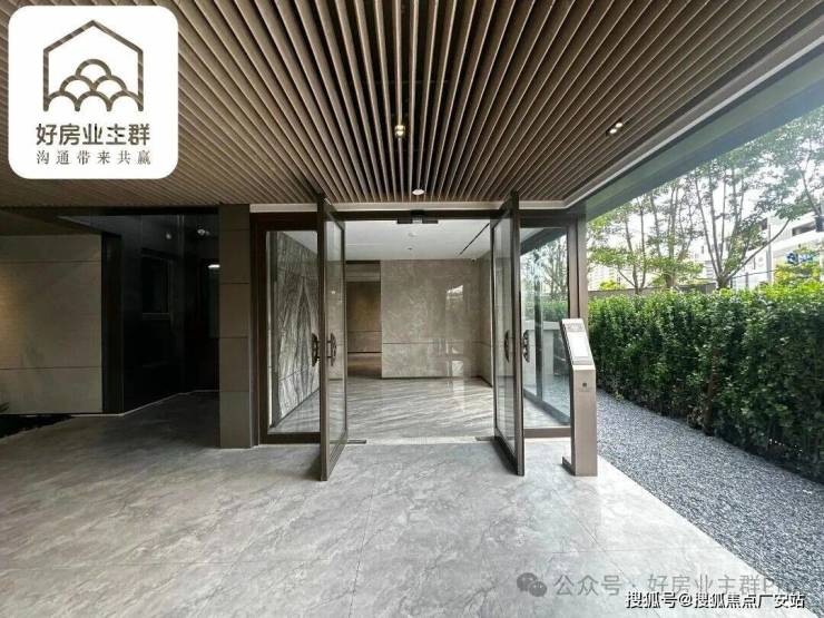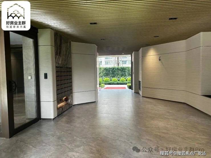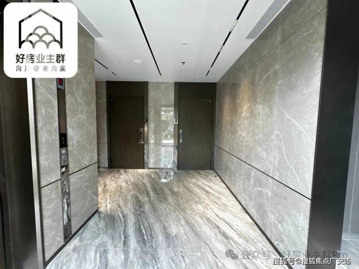 入户单元门处采用人脸识别+电动移门设计,大堂内设置了岩板背景墙,跑盘当日,在大堂内并未见绿植装饰等,设计较为简单。