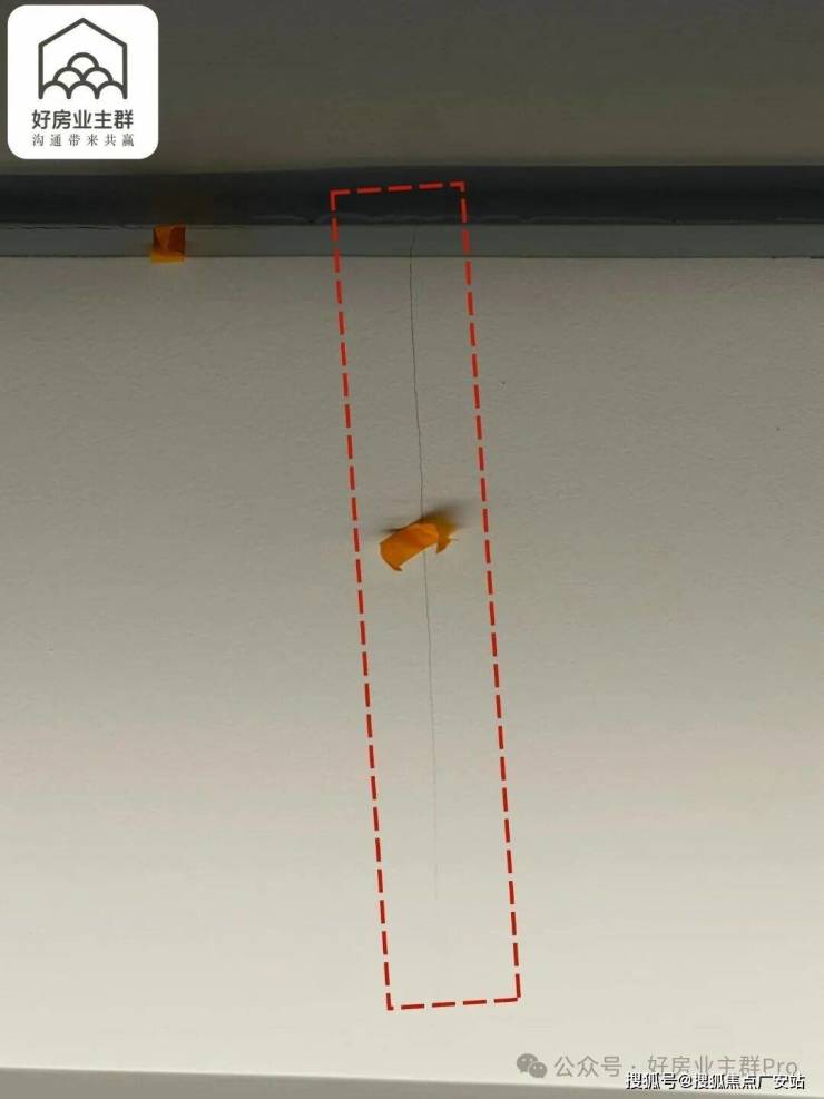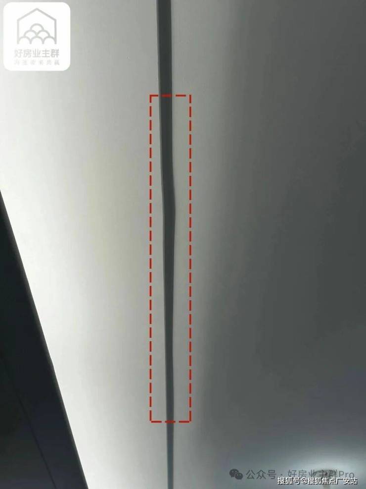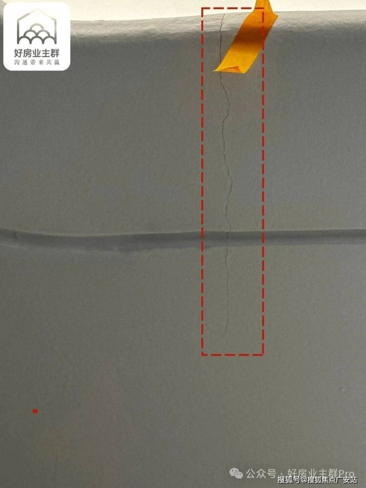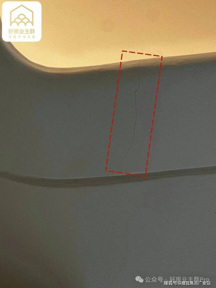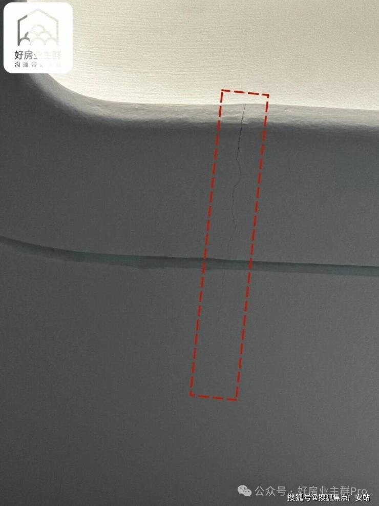 留香园抽样楼幢的室内客厅与主卧吊顶均作了圆弧设计,可是8个圆弧,全部开裂,实在让群姐想不到。
