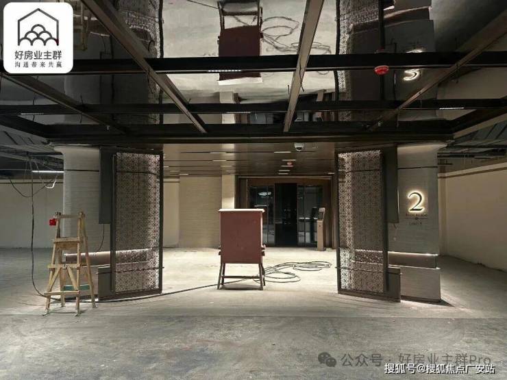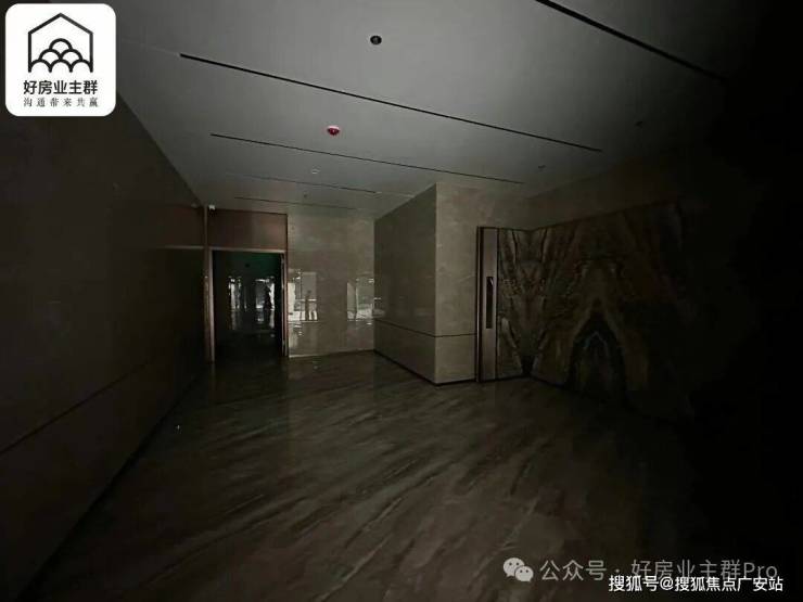 入户大堂内,设置了岩板背景墙,地下入户大堂照明设备还未安装完成,未能见整体效果。