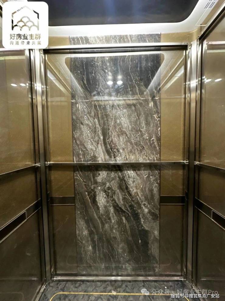 电梯轿厢内,内置空调+大理石地面,轿厢壁采用木饰面+金属线条。