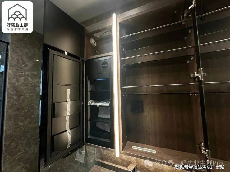 家居氛围智能控制设置在进门处,并且入户处设计一体化的玄关柜,玄关柜内配置了可抽拉式挂物,独立伞架及鞋柜消毒机。