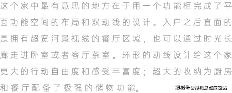 方案三易其稿,410平米的空间最终敲定的平面里只保留了两个卧室,但他们并没有把大量的空间留个客厅,而是将其均衡地分配给厨房、餐厅、茶室、卧室等生活的功能空间以及储物的空间.