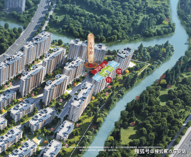 19#园心寰景楼座:12层低密小高层,双单元布局,首层增设架空泛会所,坐落两轴双环八景五园之心,内环景观步道三面环绕,南邻“方外游”,北接“碧梧轩”。
