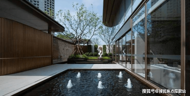 构成富有健康、静谧关怀的艺术之境;步入其中,水浪纹艺术小品、叠水台阶、镜面水景搭配户外休憩节点渐次铺陈,展现隐逸江河汇的惬意,身与心的从容。