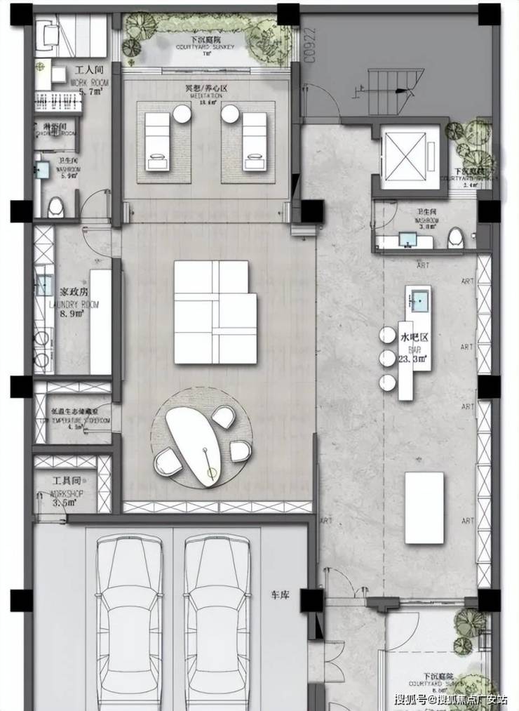 设计师以三面建筑和一面围墙,四合成内聚型的景观空间,庭院居于其中,成为建筑各房间的视线焦点。每户均有80至100平方米的开放式内庭院,宅在院中,宅院合一,天地共生,天人合一。每户地下层面均有3处花园式采光天井,保证了地下空间的舒适通透。