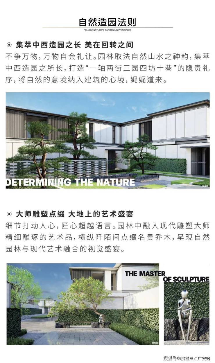 合院的景观设计体现了返璞归真,现代精致的生活本质,并且演绎出前瞻艺术,城市会客的隐贵礼序。将中国古典园林与西方园林取长补短,相得益彰,营造一轴两街三园,四坊十巷的通达之所,并融入现代工艺美术大师精典雕塑作品及名贵树种,安置于阡陌交错间的节点。艺术品装饰社区公共空间,主题阶段性布展式地呈现于业主的面前。横纵阡陌间点缀的艺术品与名贵乔木,宛如星河,异彩纷呈,呈现出自然园林与现代艺术融合的视觉盛宴。