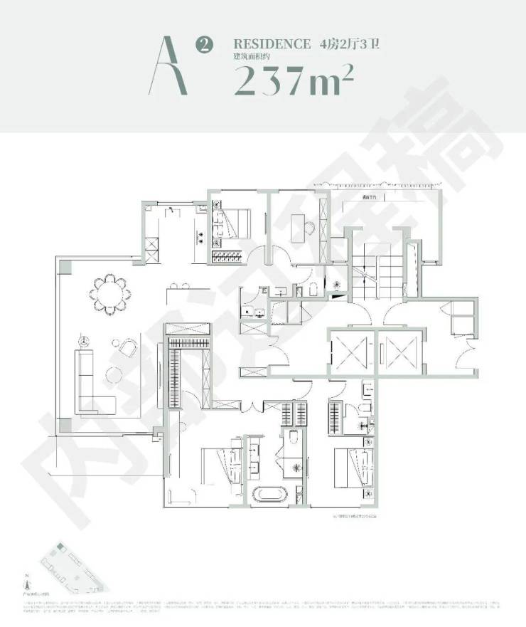 该户型是经典的四叶草布局,四开间分布在四角,兼顾私密与互动,是二胎家庭的优选;