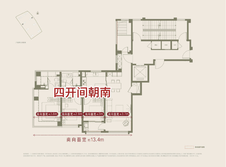 正常120㎡户型南向面宽在 9-10m,125㎡做到 13.4m,属于直接“越级”。
