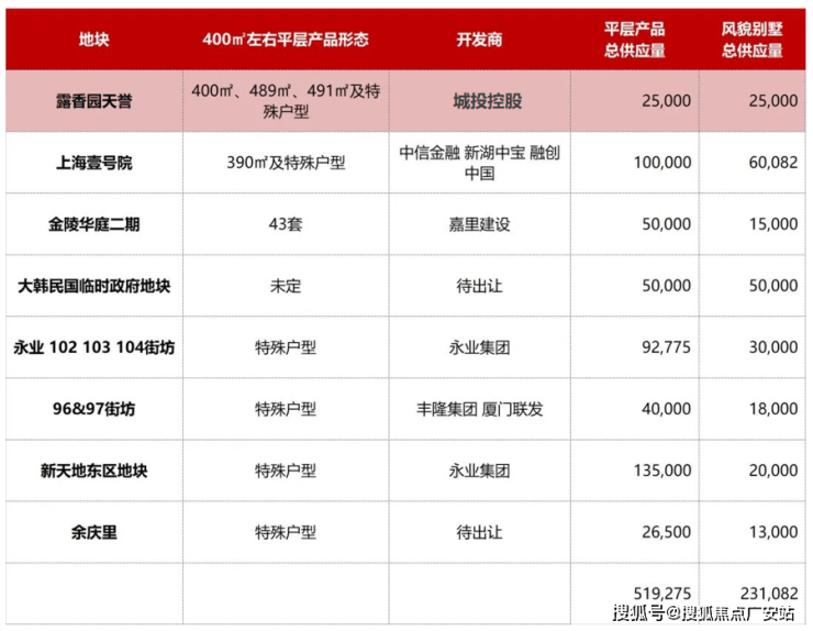 根据楼典完整统计,整个新天地、露香园、金陵路片区目前所有可供出售的项目(含所有可供开发土地),还有约75万㎡,其中大平层产品供应量还有约52万㎡,以300㎡的套均面积计算,还有1700-1800套的平层货量,应对的是4年左右的推盘周期,相当于每年供应400-450套左右。