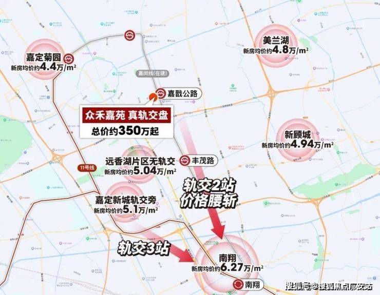 另外,距众禾嘉苑仅一站的丰茂路站,即为一主二辅枢纽体系中的嘉定东枢纽,是嘉闵线、宝嘉线的换乘站,2站内三轨交环绕的交通格局让这个项目拥有非常强大的人口导入能力、交通出行便捷度。