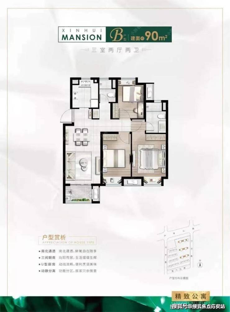 建面约94㎡3房2厅2卫户型特点:做到了三开间朝南+主卧套房设计+全卧飘窗+动静分离+卫生间干湿分离,功能性与空间感完美结合的3房“神户型”。