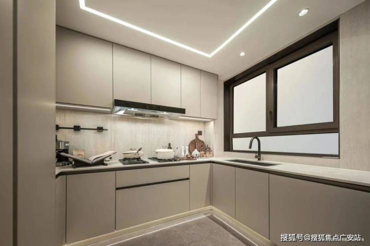u型厨房,储物空间非常足,柜体也是偏哑光质感。